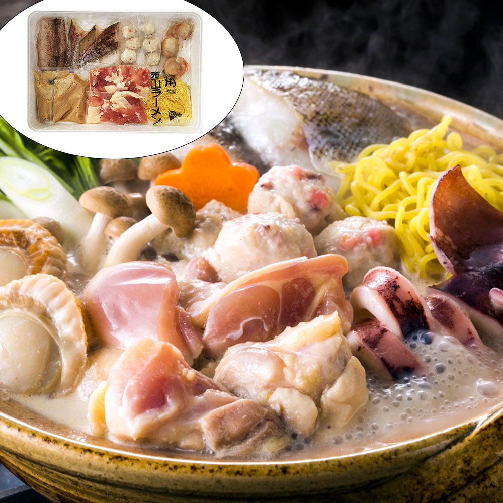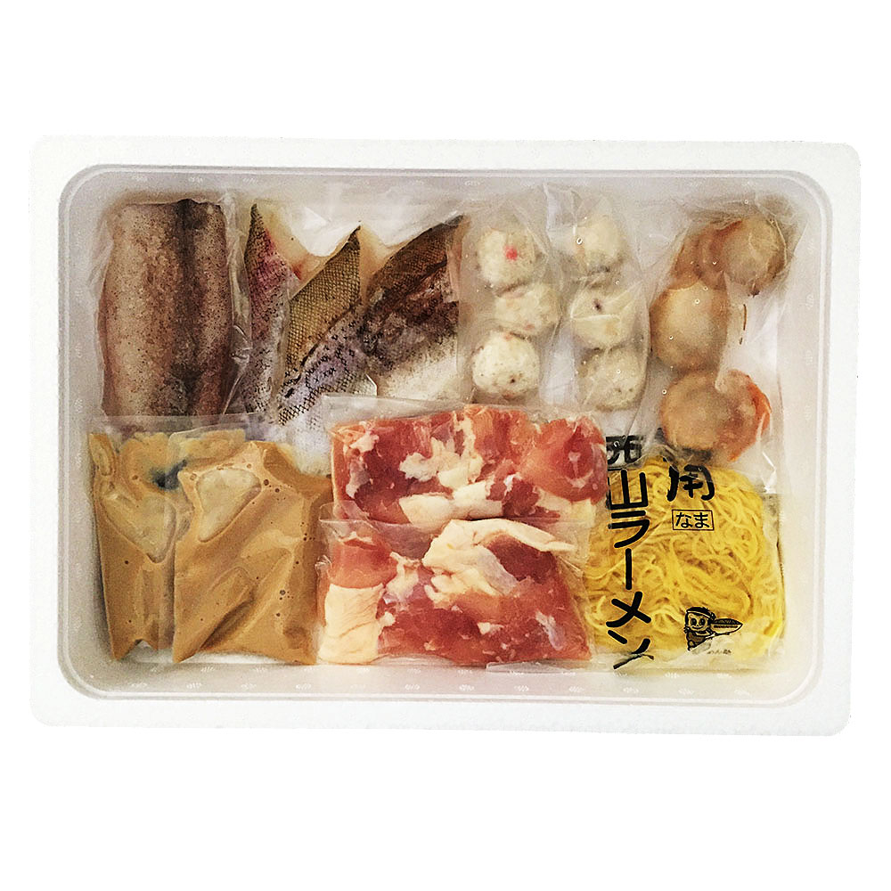 ■規格:北海道産鶏もも肉100g×2袋、ツボ抜きいか100g×1尾、ボイル帆立20g×3個、助宗鱈切身40g×3切、たこ入つみれ15g×6個、冷凍生ラーメン80g×1玉、たれ(濃縮:白湯仕立て)50ml×2袋