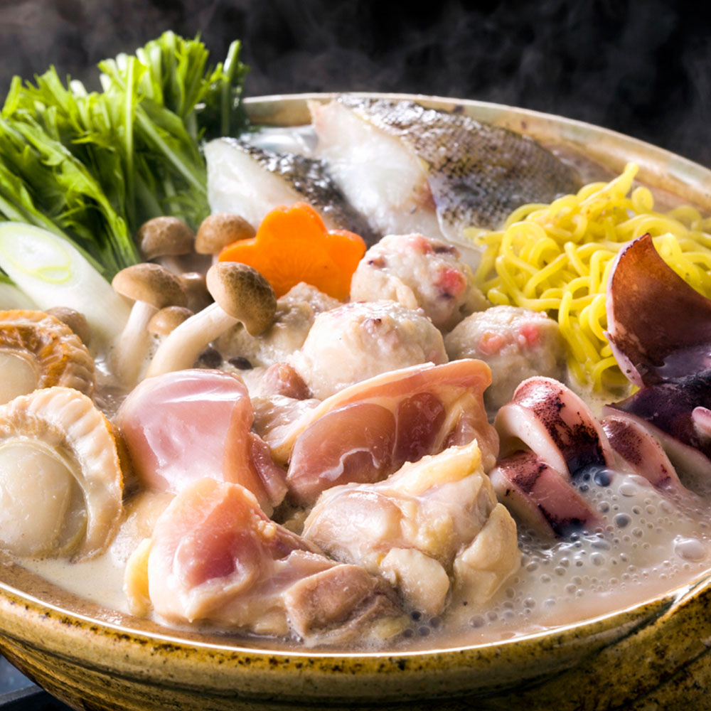 北海道産の「鶏もも肉」を主役に「真いか」や「帆立」、「助宗鱈」等の海鮮素材を詰め合わせました。鶏白湯鍋のたれは各素材とよく絡み、鶏の旨味たっぷりです。お好みで白菜や豆腐、もやし、ネギなどと一緒に煮込んでからお楽しみください。