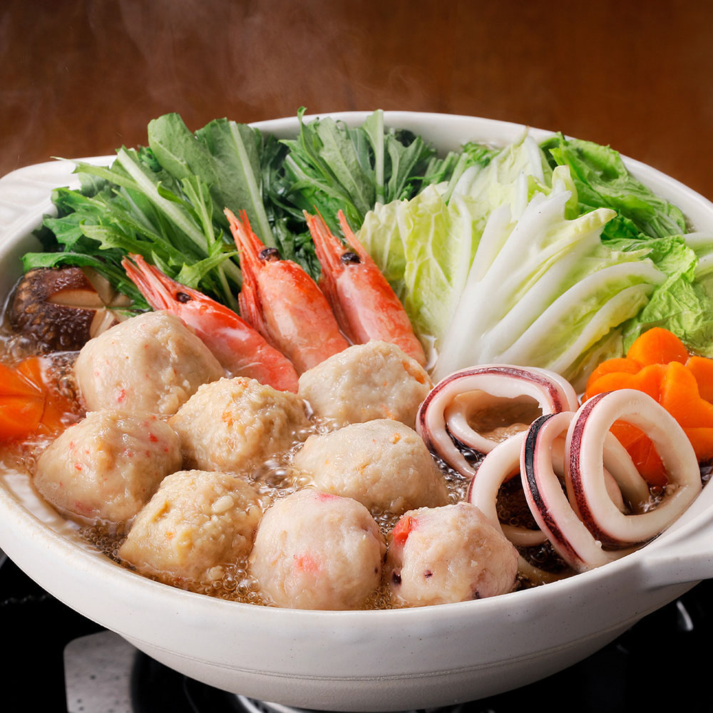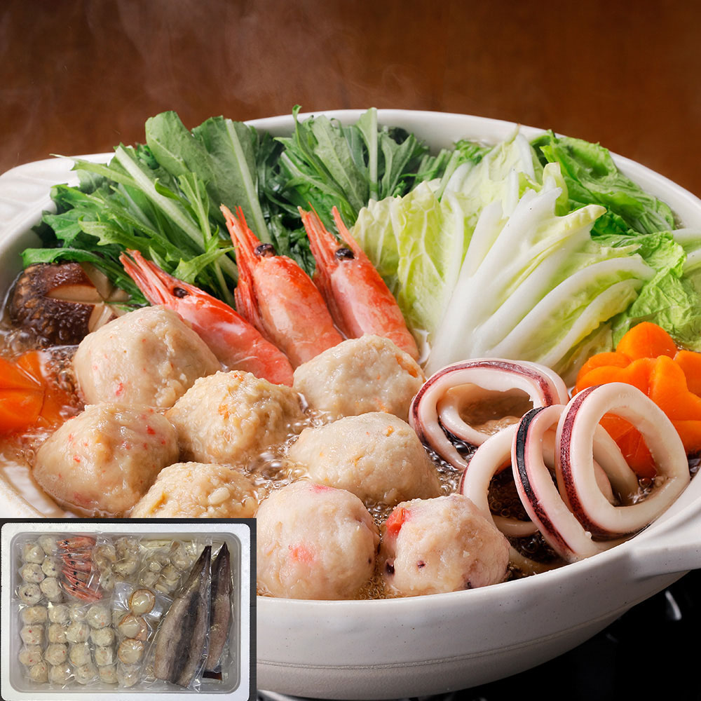 「かに入つみれ」・「えび入つみれ」・「とりごぼうつみれ」・「たこ入つみれ」など、ボリュームいっぱいのつみれを主役に「えび」や「いか」等の魚介を詰め合わせました。「4種のつみれ」と「各具材」の旨味が鍋いっぱいに広がります。ご自宅の野菜も一緒に煮込んでからお楽しみください。