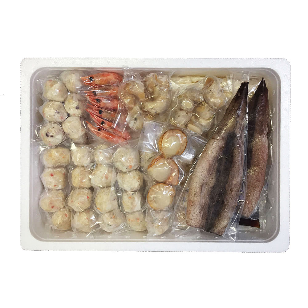 ●鍋具材:スルメイカ(北海道産)、たこ入つみれ【魚肉すり身、豚脂、澱粉、 種もの(たこ、紅生姜、ねぎ)、粒状大豆たん白、砂糖、食塩、本みりん、魚介エキス】、かに入つみれ【魚肉すり身、豚脂、澱粉、種もの(かに風味蒲鉾、玉ねぎ、 かに正肉)、粒状大豆たん白、全卵、魚介エキス、砂糖 、食塩、本みりん】、えび入つみれ【魚肉すり身、豚脂、種もの(おきあみ、玉ねぎ、えび、ねぎ)、澱粉、粒状大豆たん白、砂糖、食塩、魚介エキス、本みりん】、とりごぼうつみれ【魚肉すり身、鶏肉、種もの(玉ねぎ、ごぼう、人参、生姜)、鶏挽肉、パン粉、全卵、粒状大豆たん白、砂糖、小麦粉、食塩、発酵調味料、魚介エキス、白味噌、たん白加水分解物】、ツブ(カナダ産)、ホタテガイ(北海道産)、 ボイル海老(甘えび(カナダ産)、食塩)/加工澱粉、ソルビット、調味料(アミノ酸等)、紅麹色素、リン酸塩(Na)、酸味料、(一部に卵・乳成分・小麦・えび・かに ・豚肉・鶏肉・大豆・いかを含む)