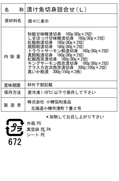 ■規格:秋鮭甘味噌漬切身80g×2切、しまほっけ甘味噌漬切身80g×2切、紅鮭粕漬切身80g×2切、銀鱈粕漬切身80g×2切、トラウトサーモン粕漬切身80g×2切、真鱈粕漬切身80g×2切、紅鮭西京漬切身80g×2切、キングサーモン西京漬切身80g×2切、アラスカ吉次西京漬切身100g×2切、真いか粕漬け150g×2枚