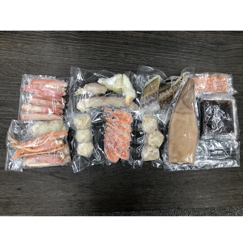 ■規格:ゆでずわいがにカット150g、生たらばがにカット100g、生ずわいがに棒ポーション100g、ボイル海老×6、ボイル帆立×3、かに入つみれ×3、助宗鱈切身40g×3、ツボ抜きいか100g×1、だし用昆布5g×2、ポン酢たれ30g×4、紅葉おろし10g×4