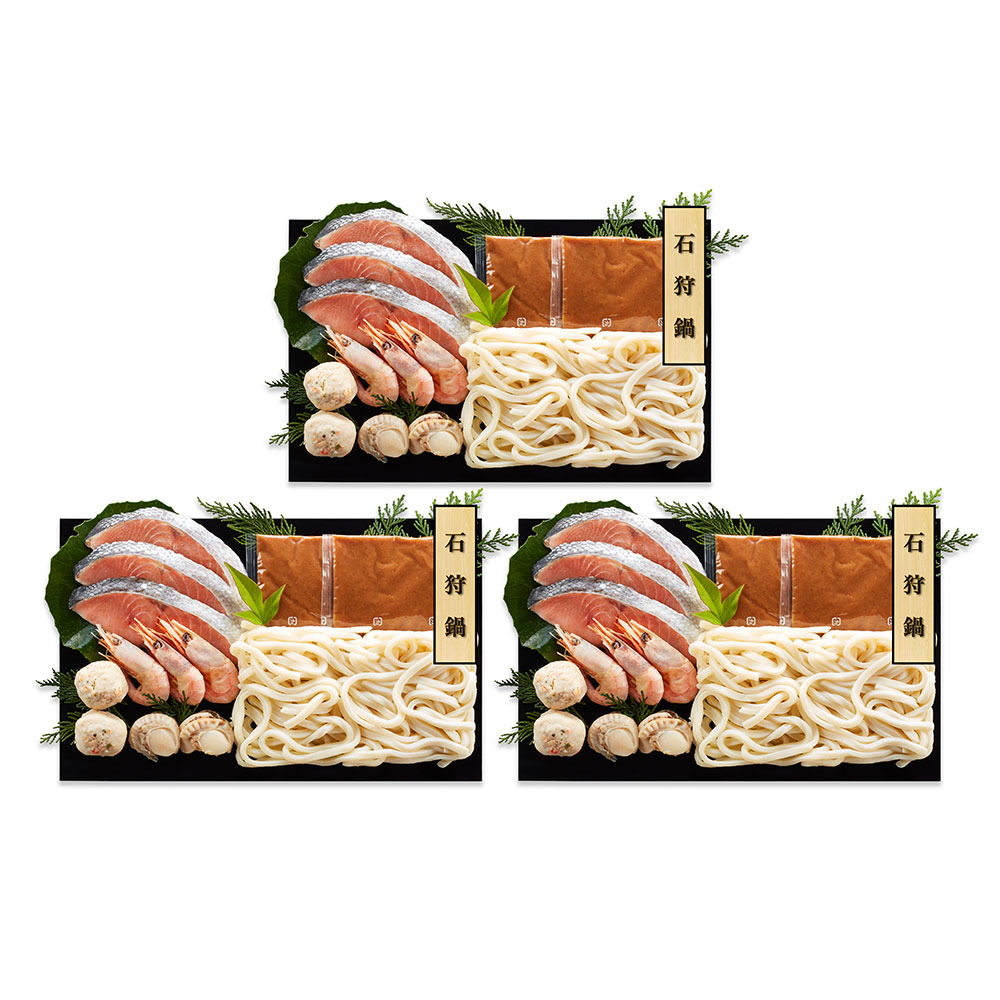 ■規格:個食用石狩鍋セット(秋鮭切身40g×3切、ボイル海老6g×3尾、ボイル帆立20g×2個、えび入つみれ20g×2個、冷凍うどん250g×1玉、たれ(濃縮:味噌)50g×2袋 ※1~2人前) ×3