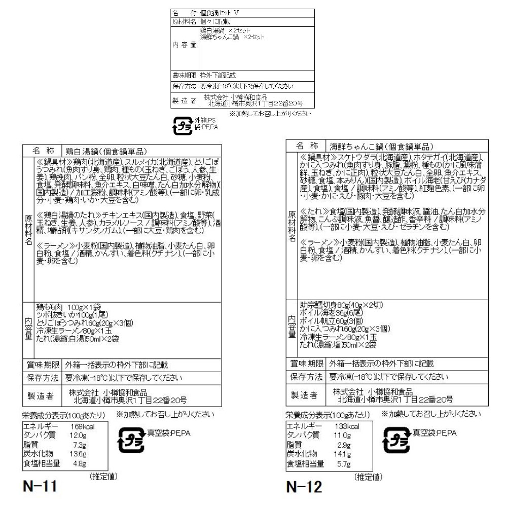 北海道産の鶏もも肉や、真いか、他にもつみれなどを鶏の旨味たっぷりの白湯仕立てのたれでいただく鶏白湯鍋の具材と、北海道産の助宗鱈や、帆立の他にも海老、つみれなどを旨味ある塩仕立てのたれでいただく海鮮ちゃんこ鍋の具材を1~2人前の少量タイプにセットしました。お好みで野菜などを足していただくだけで本格的な鍋をお楽しみいただけます。〆はラーメンでどうぞ!!