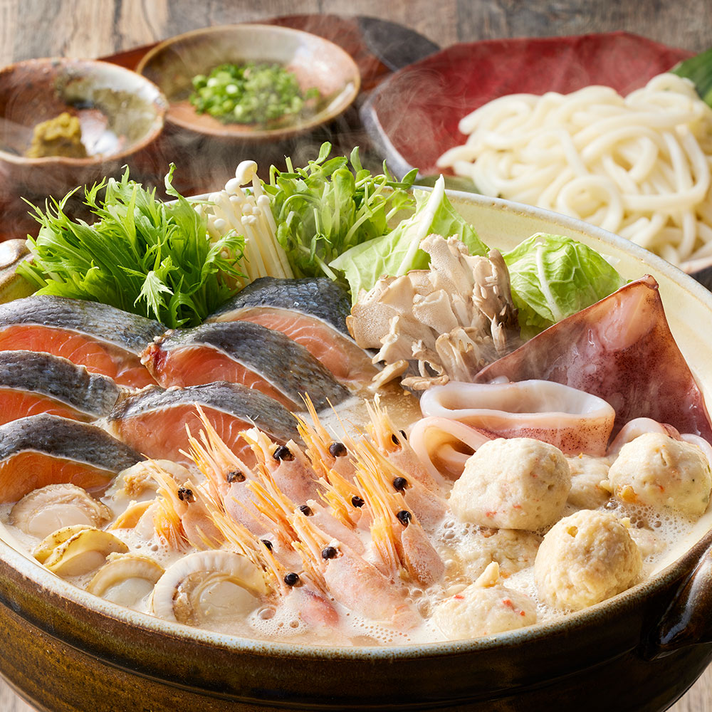 北海道の郷土料理である味噌仕立てのたれでいただく石狩鍋。北海道産の秋鮭、帆立、真いかをはじめ、3種のつみれや、ボイル海老など7種類の具材を詰め合わせました。体の芯から温まる一品です。人参や白菜などの野菜をご自宅でご用意していただき具材と一緒に煮込んでからお召し上がりください。〆はうどんでどうぞ!!