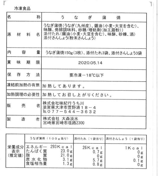 ●うなぎ蒲焼:うなぎ(九州産)、醤油(小麦・大豆を含む)、味酢、発酵調味料、砂糖/増粘剤(加工澱粉)