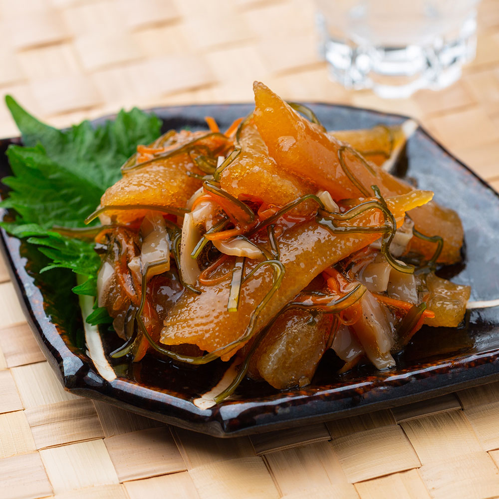 数の子(アメリカ又はカナダ産)、にんじん、いか、昆布、醤油(小麦・大豆を含む)、砂糖、水飴、ぶどう糖果糖液糖、ぶどう糖、醸造酢、食塩、かつおエキス(サバを含む)、昆布エキス、寒天/増粘剤(キサンタン)
