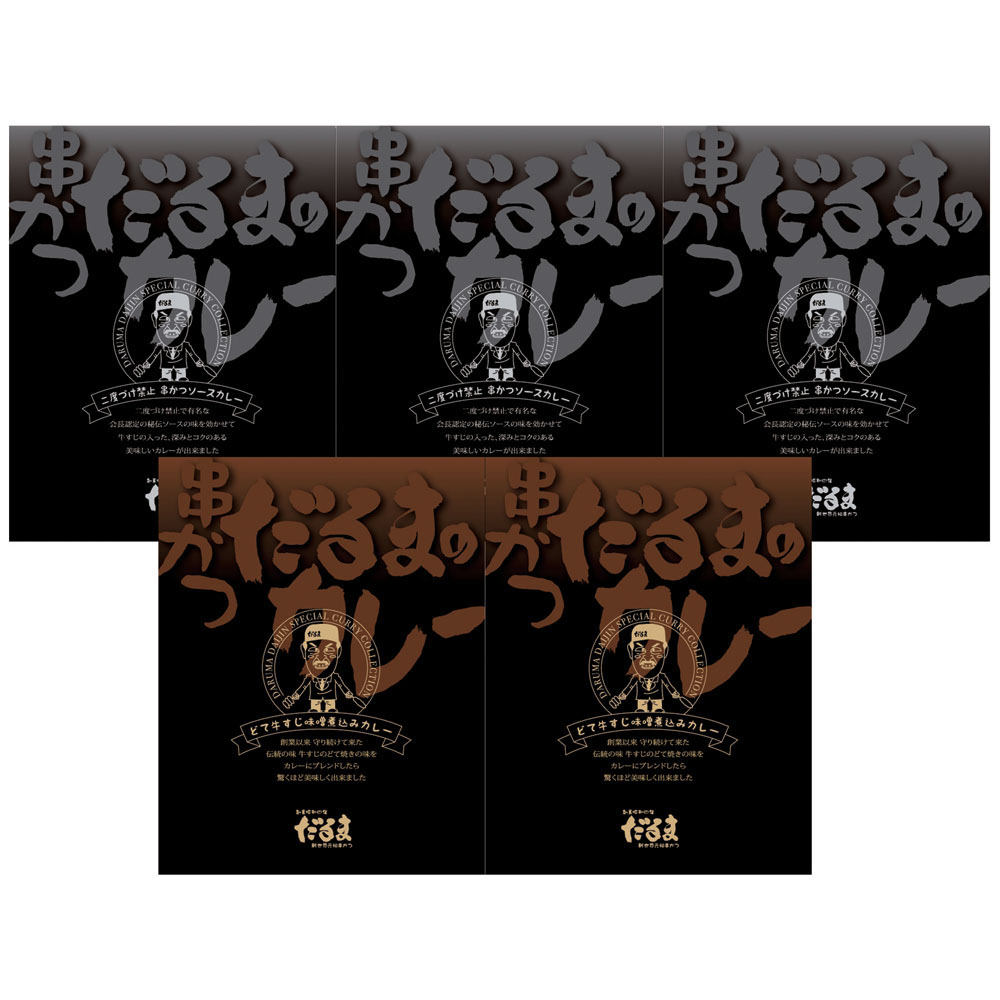 大阪新世界元祖串かつ、創業昭和四年「串かつだるま」のレトルトカレー2種5個セットです。大阪名物どて焼きをカレーにアレンジした味噌がほどよくきいた「どて味噌煮込みカレー」と秘伝の串かつソースを隠し味にした「二度漬け禁止串かつソースカレー」。どちらも国産の牛すじを使用した味わい深いカレーです。