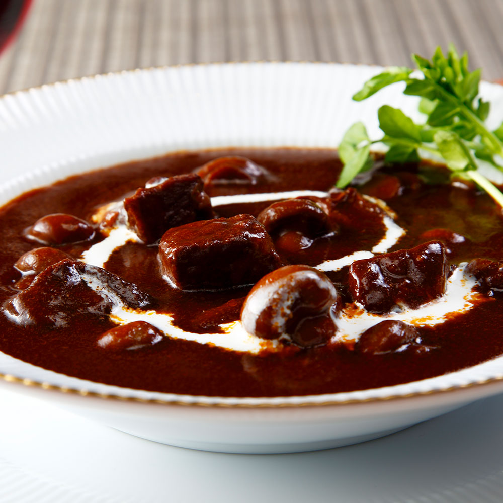 六本木リューズ飯塚シェフが監修する濃厚な味わいのビーフシチュー。赤ワインを効かせたデミグラスソースでじっくり煮込み、風味豊かに仕上げました。ぷりぷりのマッシュルームと牛肉の旨みが詰まった、本格フレンチのビーフシチューをお届けします。