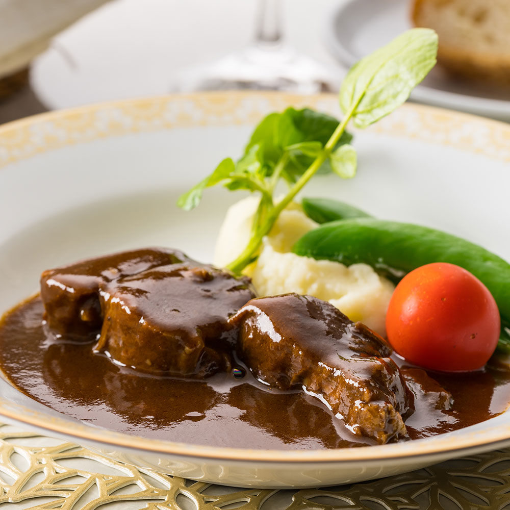 たっぷりの赤ワインとデミグラスソースで牛すね肉をじっくり煮込み、手間ひまをかけて丁寧に作りました。とろけるような牛すね肉の濃厚で芳醇な味わいをお楽しみください。お好みでマッシュポテトや彩り野菜を添えて頂くとより華やかなメインディッシュとなります。パーティーにもピッタリです。