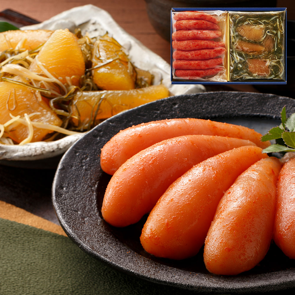 ピリッとした辛さの中にも味わい深い辛子明太子と数の子をたっぷりと使い昆布・いかを特製醤油ダレにじっくりと漬け込んだ豊な風味と食感の松前漬けのセットです。
