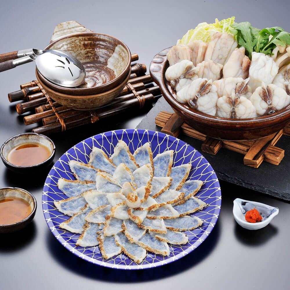 山口県で水揚げされた活天然マフグ身の表面を強火でサッと炙り、旨味と新鮮さを閉じ込め職人が丁寧に刺身にしました。外は香ばしく、中はしっとりとした食感と旨味のたたき刺身と数ある鍋料理のなかでもひときわ旨味たっぷりで奥深い味わいの国産ふくちり。ちり鍋の後の残ったダシで作る雑炊もお楽しみいただけます。