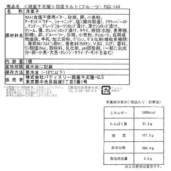タルト(食塩不使用バター、砂糖、卵、小麦粉、アーモンドパウダー、ショートニング、 塩)(国内製造)、 フラワーペースト、マンゴー、グレープフルーツシロップ漬け、洋ナシシロップ漬け、 クリーム、苺、オレンジシロップ漬け、キウイ、糖類(水飴、麦芽糖、砂糖)、卵、ブルーベリー、砂糖、小麦粉、チョコレート、食用植物油脂、牛乳/加工澱粉、グリシン、ゲル化剤(増粘多糖類)、 保存料(ソルビン酸K)、着色料(カロチン、V.B2、ココア)、香料、リン酸塩(Na)、酸味料、乳化剤、pH調整剤、(一部に乳成分・卵・小麦・大豆・オレンジ・キウイ・アーモンドを含む)