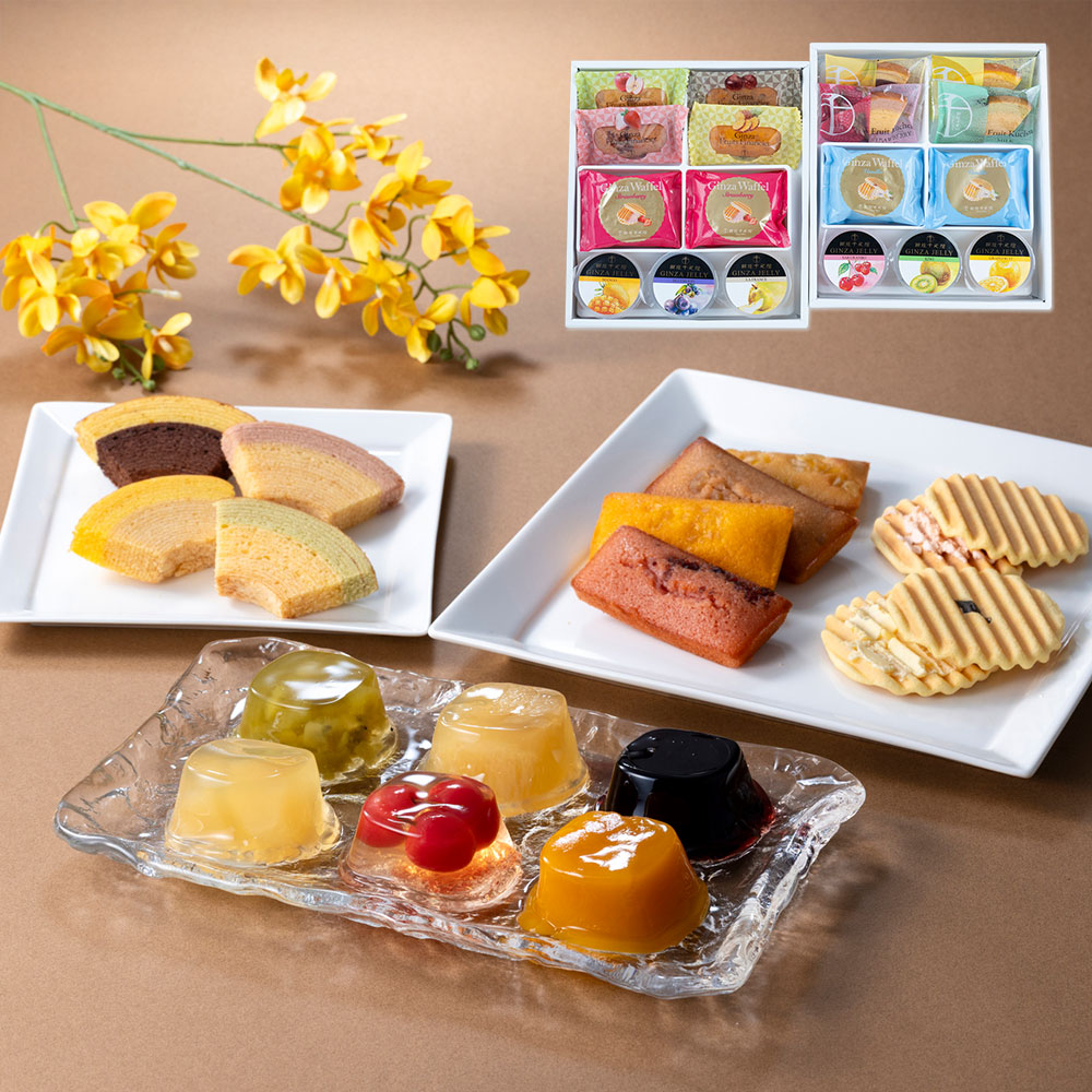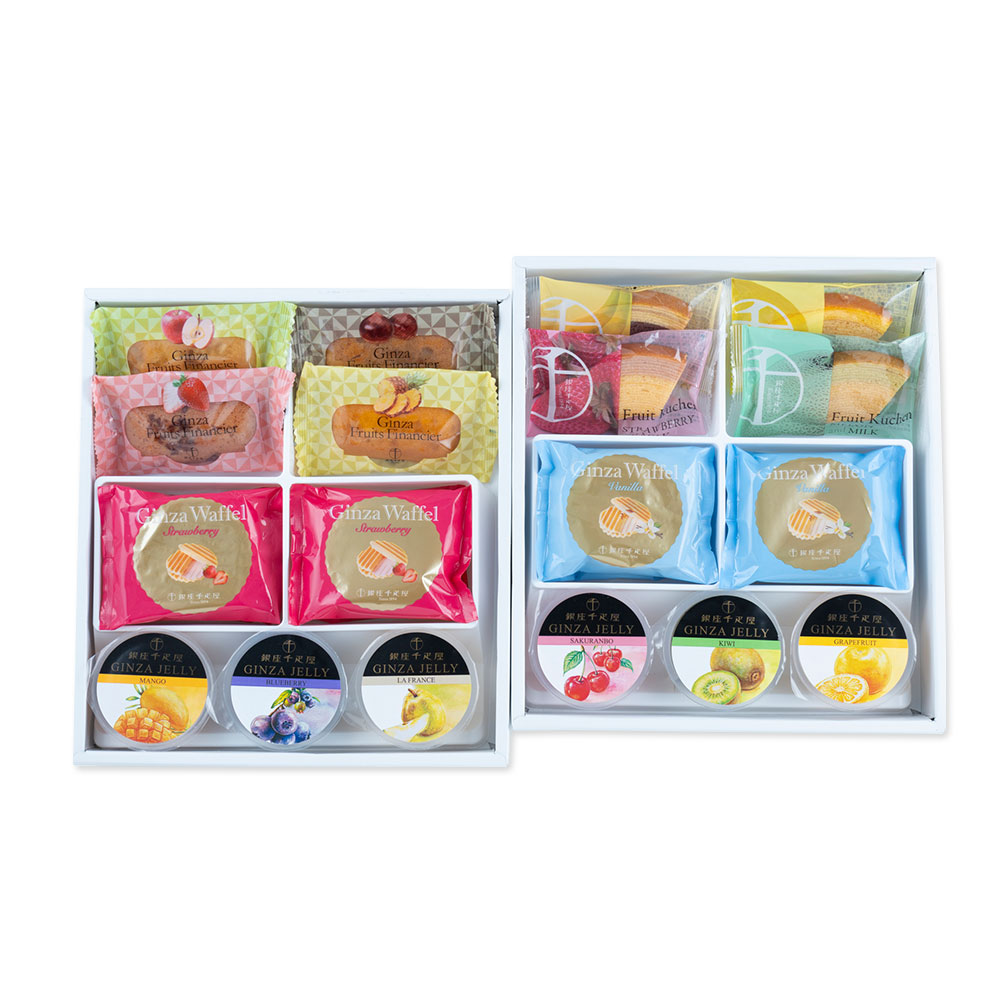 ■規格:銀座ゼリー(ラ・フランス、マンゴー、キウイ、グレープフルーツ、ブルーベリー、さくらんぼ)×各1、銀座フルーツフィナンシェ(ストロベリー、パイナップル、アップル、マロン)×各1、銀座ヴァッフェル(バニラ、いちご)×各1、銀座フルーツクーヘン(イチゴ&ミルク、レモン&はちみつ、メロン&ミルク、バナナ&チョコ)×各1
