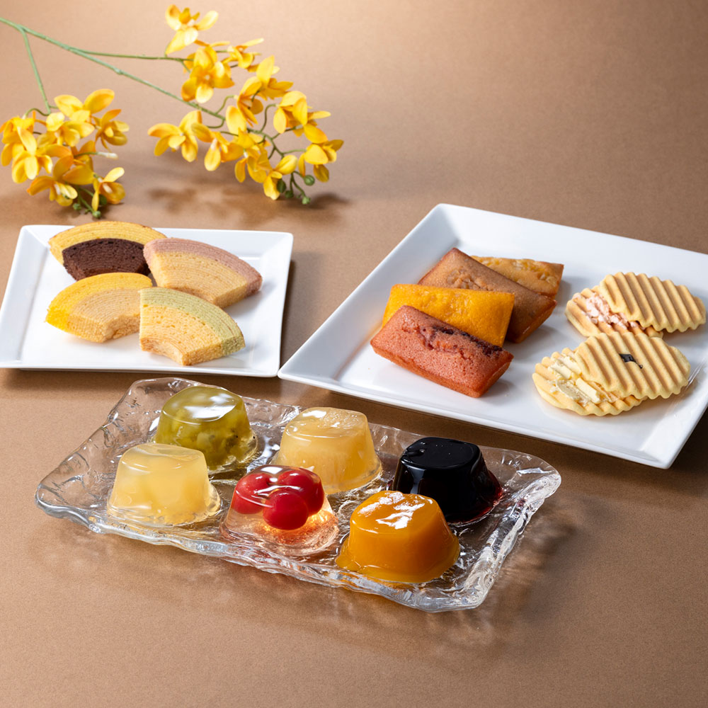 生地にフルーツピューレを混ぜ込み焼き上げたフルーツフィナンシェ。国産果汁を使用したフルーツゼリー。サクサクとした食感のワッフルにクリームをサンドしたヴァッフェル、さらにフルーツクーヘンをバラエティ豊かに詰合せました。