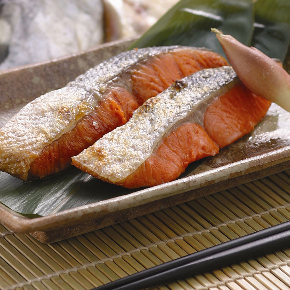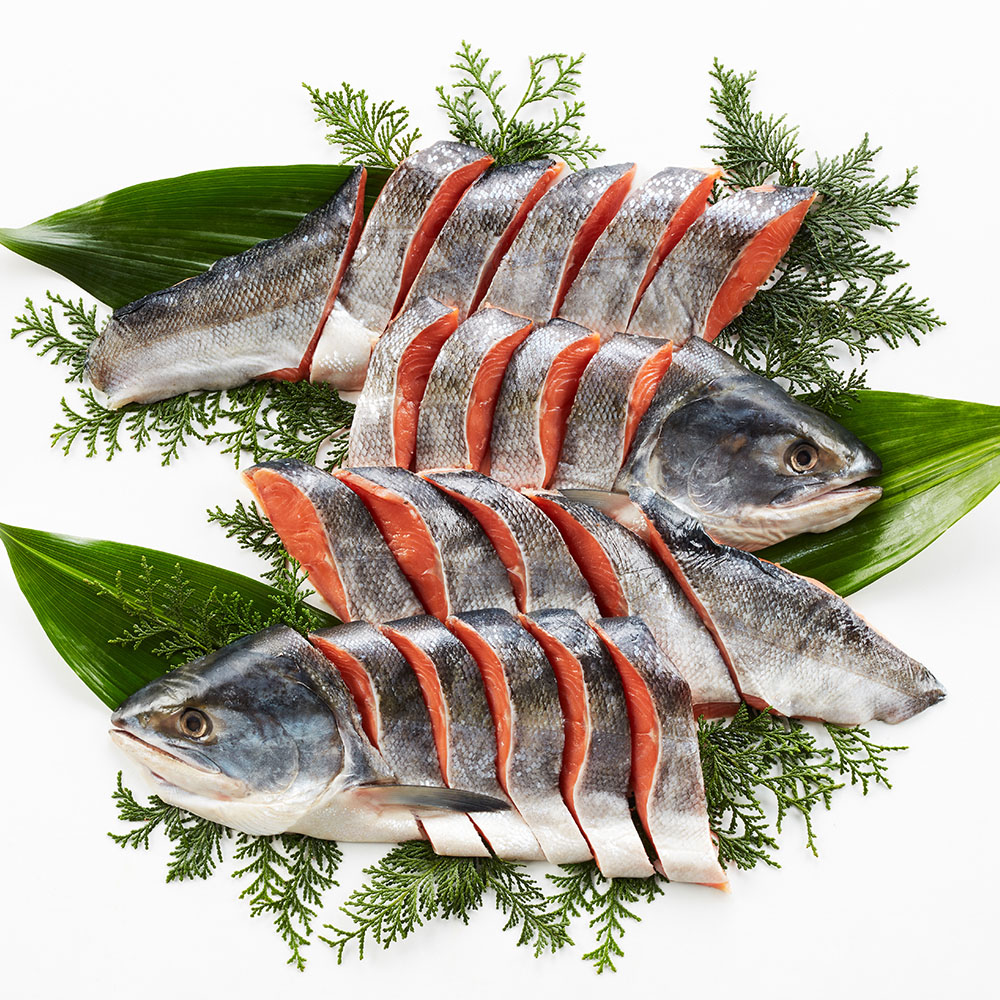 北海道で水揚げされた秋鮭を前浜の石狩の加工場で一次加工(生処理)から新巻の製品加工まで一貫製造された新巻鮭です。半身を二分割で真空パックにしてお届けしますので、必要な分だけ使用でき、冷凍庫にも保存しやすく便利です。