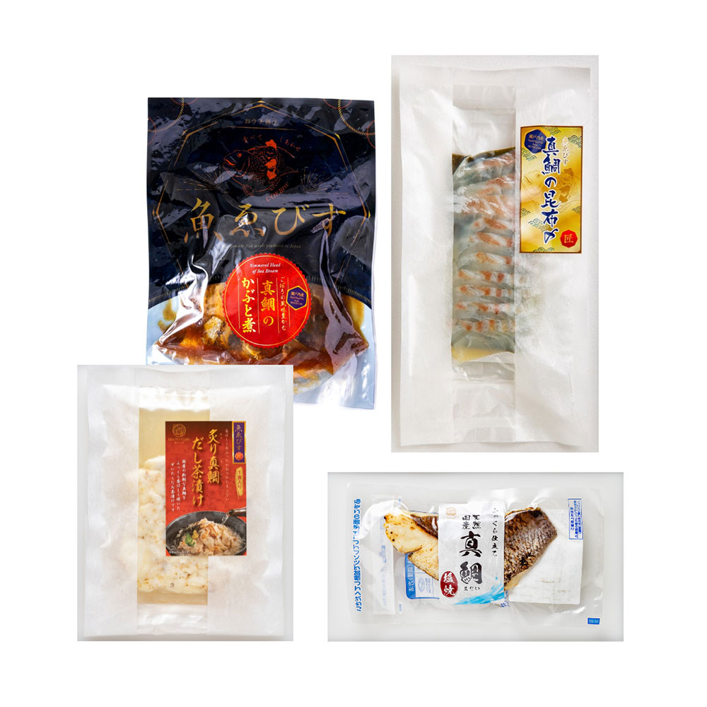 ■規格:真鯛のかぶと煮295g×1、真鯛の昆布〆200g×1、炙り真鯛だし茶漬け200g×1、真鯛の塩焼70g×1