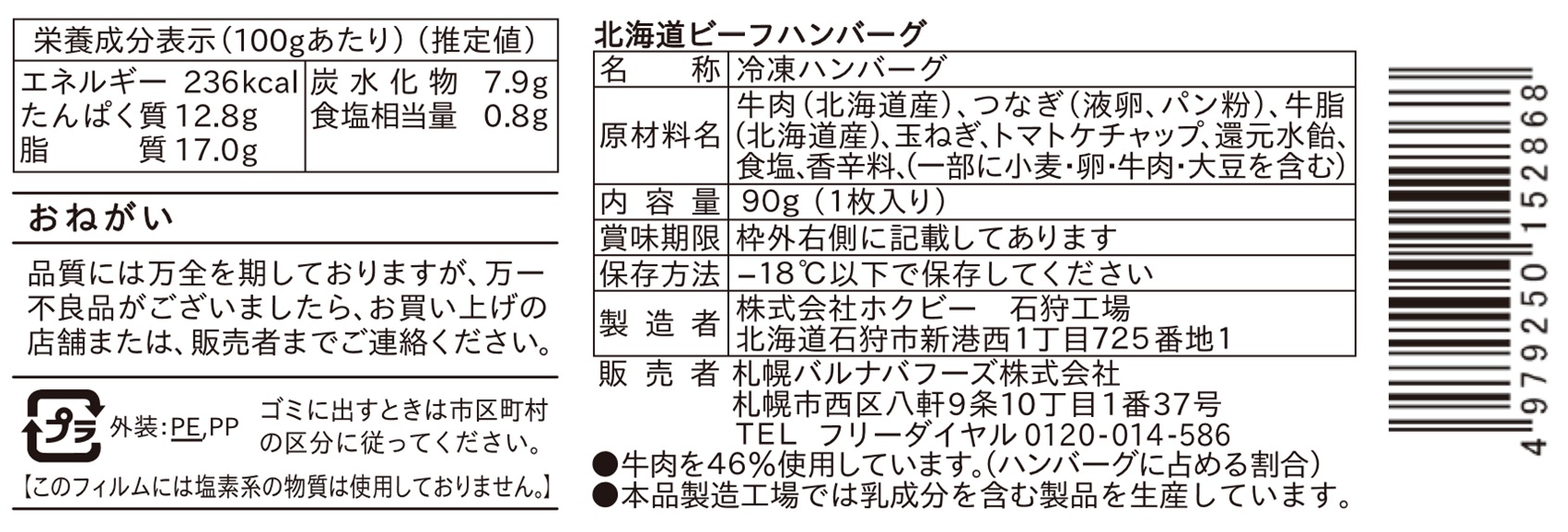 牛肉(北海道産)、つなぎ(液卵、パン粉)、牛脂(北海道産)、玉ねぎ、トマトケチャップ、還元水飴、食塩、香辛料、(一部に小麦・卵・牛肉・大豆を含む)