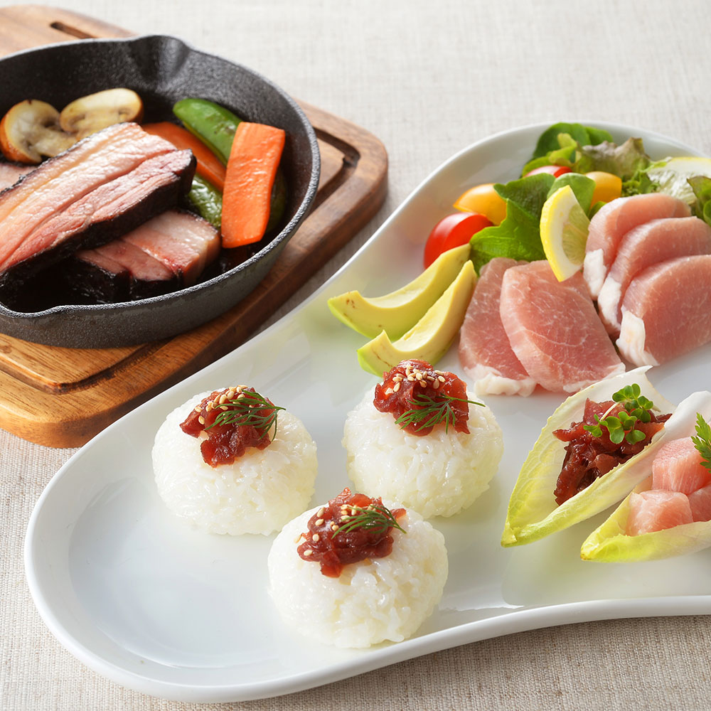 DLG( ドイツ農業協会)国際品質協議会で金賞受賞農家のベーコンはそのままステーキがおススメ。フライパンで焼くと程よく脂肪が溶け美味しく召し上がれます。しばれ生ハム冊取りは「ドイツ岩塩」を使用し、塩せきした豚肉のまろやかな味わいが楽しめる生ハムです。牛もも肉をドイツ岩塩を使用した調味液に漬け込んで仕上げた牛生ハムユッケのセットになります。