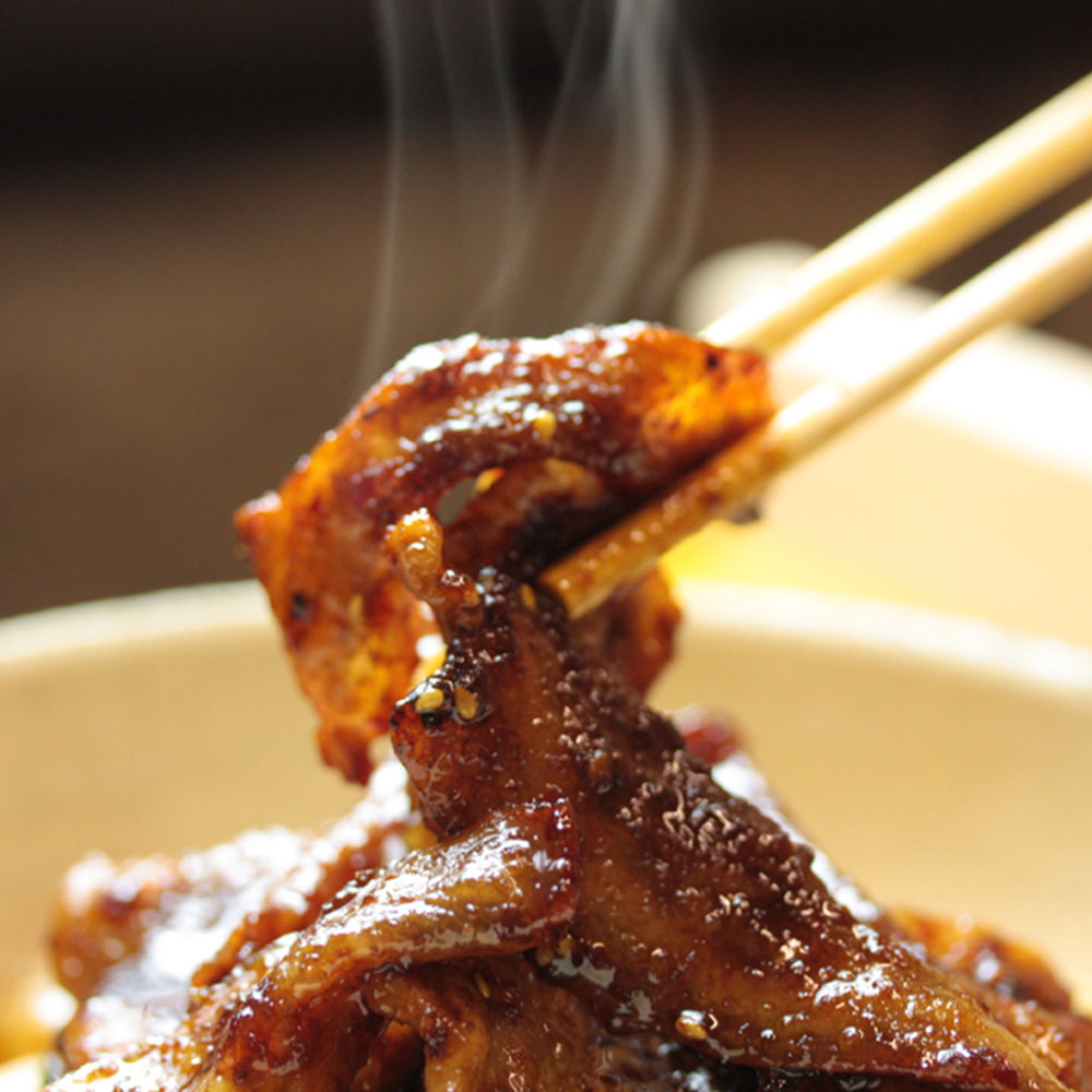 豚肉(国産)、醤油、砂糖、味醂、ゴマ油、味噌、甜麺醤、豆板醤、玉葱、オイスターソース、パイナップル、リンゴ、白ゴマ、ニンニ ク、生姜、唐辛子/アルコール、酒精、ビタミンC、加工デンプン、香料、クエン酸、乳酸、増粘剤(グァガム)、(一部に小麦・大豆・ゴマ・豚肉・リンゴを含む)