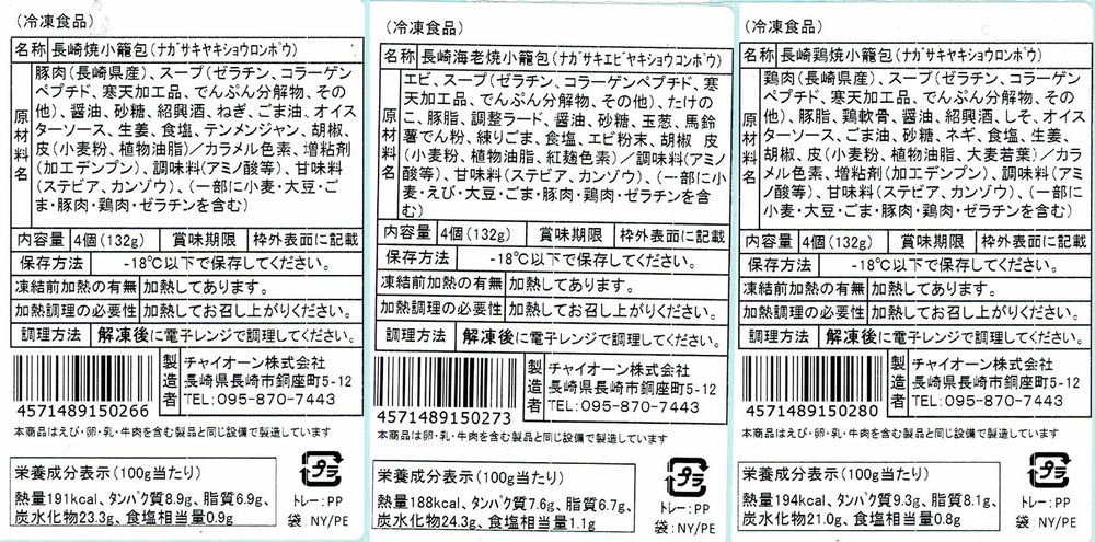 ●長崎鶏焼小籠包:鶏肉(長崎県産)、スープ(ゼラチン、コラーゲン ペプチド、寒天加工品、でんぷん分解物、その他)、豚脂、鶏軟骨、醤油、紹興酒、しそ、オイスターソース、ごま油、砂糖、ネギ、食塩、生姜、 胡椒、皮(小麦粉、植物油脂、大麦若葉)/カラメル色素、増粘剤(加工デンプン)、調味料(アミノ酸等)、甘味料(ステビア、カンゾウ)、(一部に小麦・大豆・ごま・豚肉・鶏肉・ゼラチンを含む)