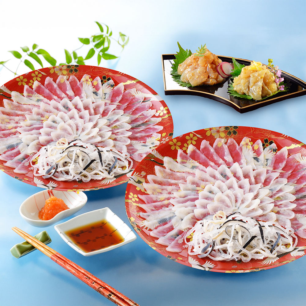 ■規格:とらふぐ刺身90g×2、とらふぐ皮30g×2、とらふぐ塩辛60g×2、とらふぐ塩辛(ゆず胡椒風味)60g、ふくポン酢180ml、もみじおろし10g×4