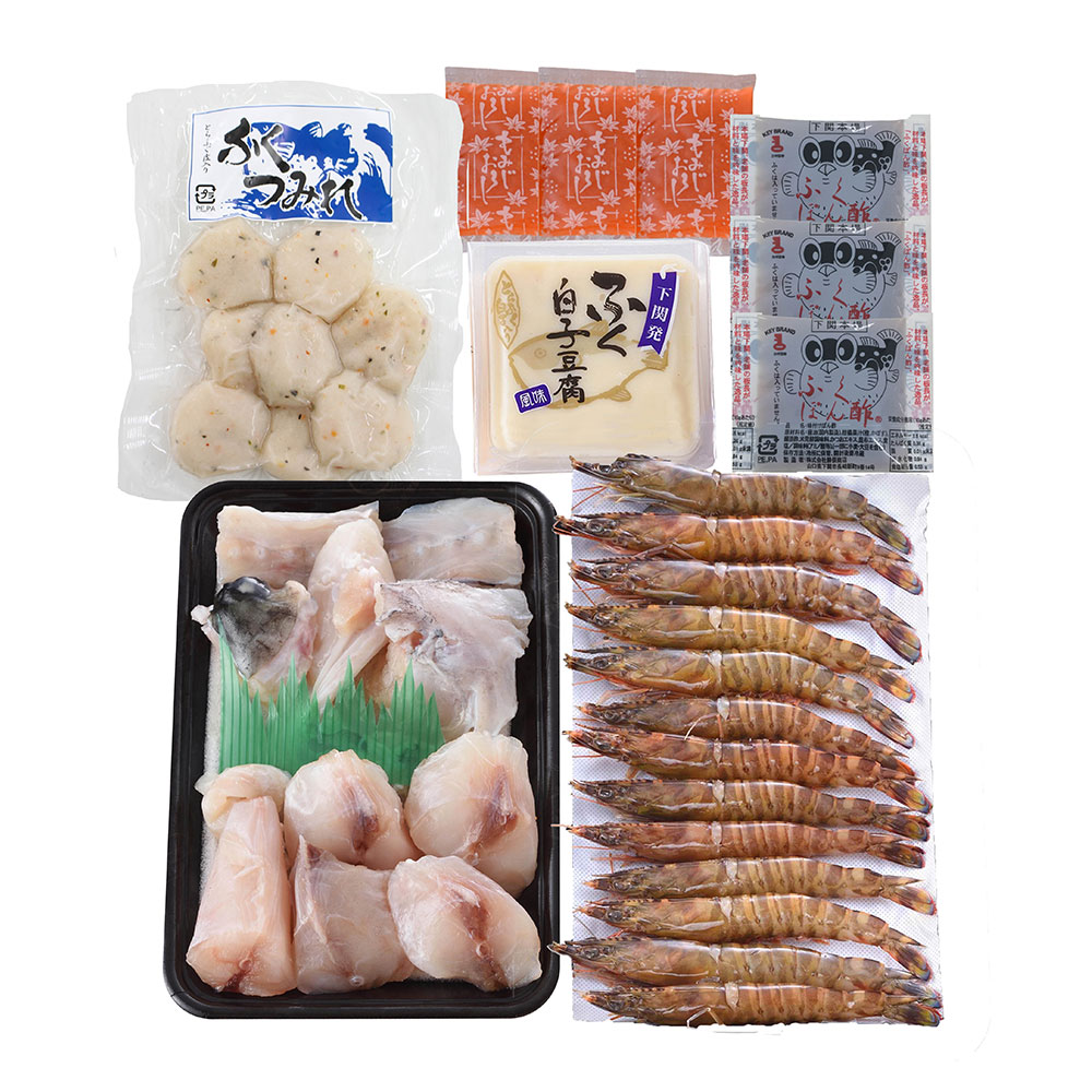 ■規格:ふぐちり(シロサバフグ切身、トラフグアラ)200g、車海老(刺身用)200g、ふぐ白子豆腐130g、ふぐつみれ100g、ふくポン酢10g×3、もみじおろし10g×3