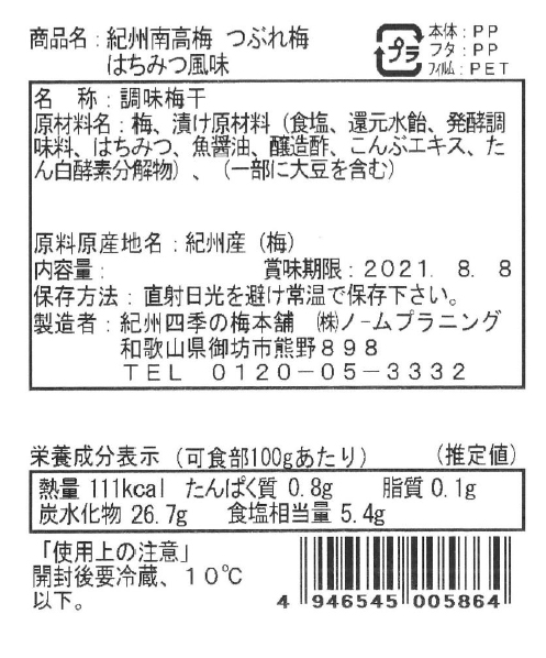 厳選された紀州産南高梅の中から、大粒、肉厚の梅干しだけを選りすぐり、合成着色料、人工甘味料不使用で体に優しい製法で仕上げました。まろやかな味わいのはちみつ風味の梅干しです。