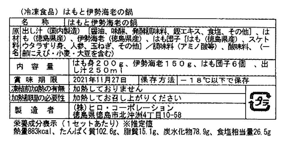 ■規格:伊勢えび150g、はも身50g×4、はも団子25g×6、特製出し汁250ml