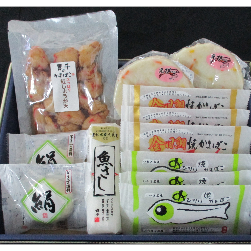 紅しょうがを使用した揚げかまぼこや大豆の風味が口いっぱいに広がるとうふの蒲鉾、蒲鉾の身に「めひかり・金目鯛」を練り込みソフトな食感で食べやすい焼きかまぼこ等の入った詰合せです。おかずやおつまみ、おやつにも利用できる蒲鉾詰合せです。
