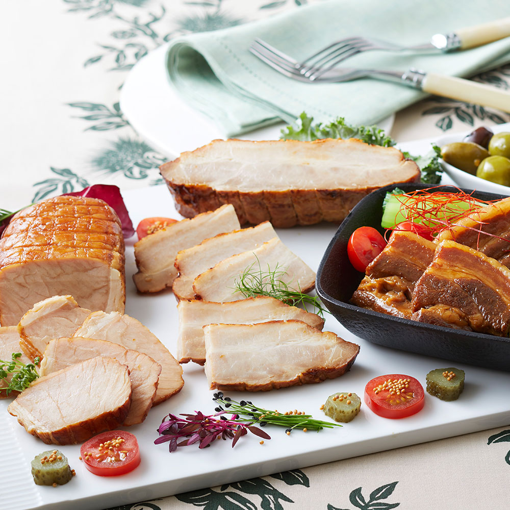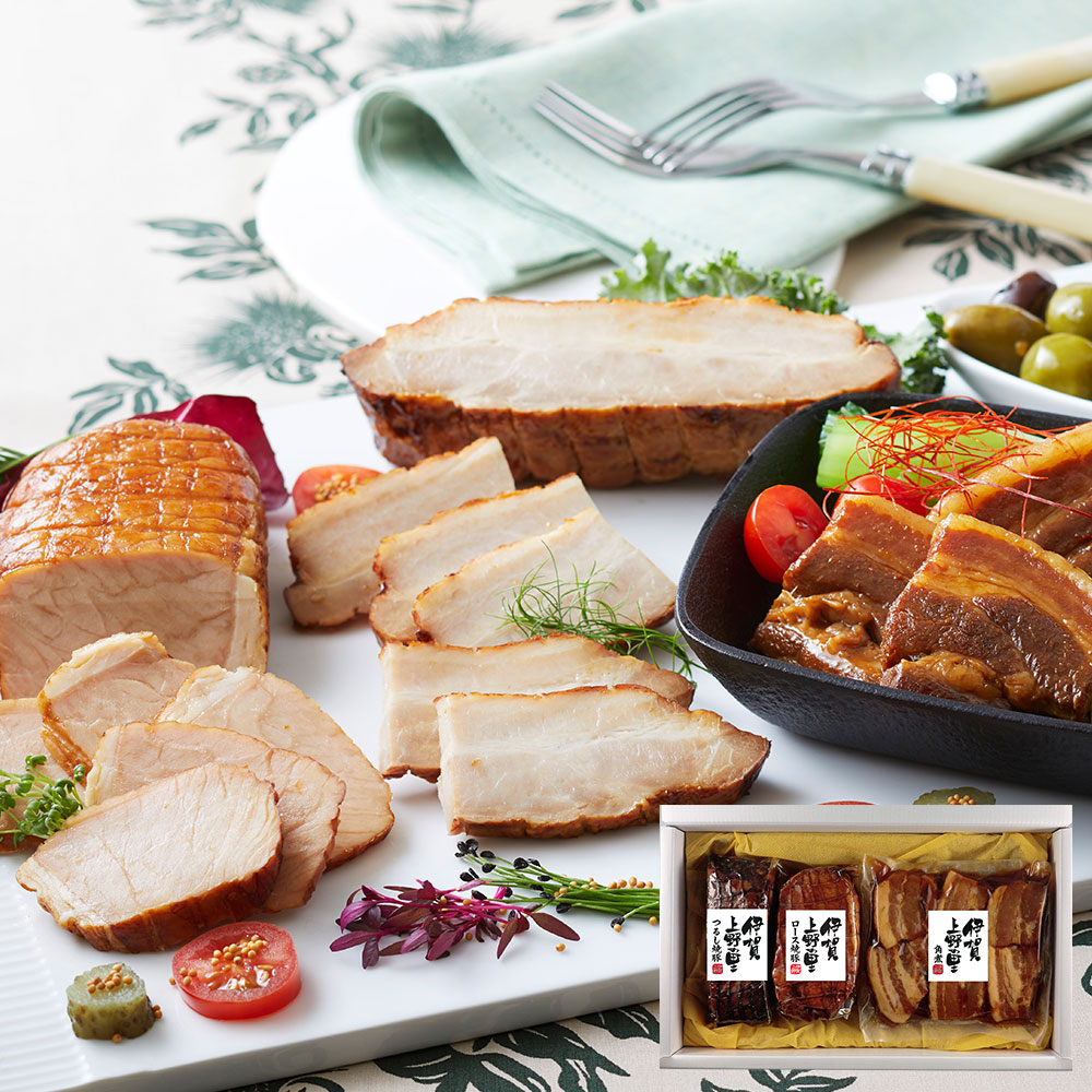 豊かな風土と、清らかな水に恵まれて栄えてきた伊賀盆地。その風土のなか、職人が織りなす巧みな技により作り上げました。一本一本つるし焼きした自慢の焼豚と、独自の加熱製法により、しっかりお肉に味が染み込んだ豚角煮、トンポーロのセットです。