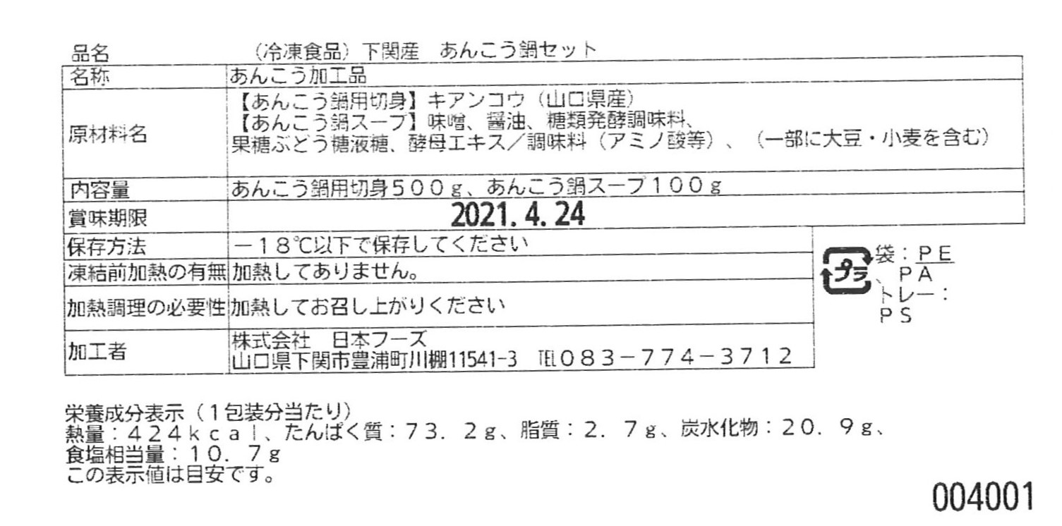 ●あんこう鍋スープ:味噌、醤油、糖類発酵調味料、果糖ぶどう糖液糖、酵母エキス/調味料(アミノ酸等)、(一部に大豆・小麦を含む)