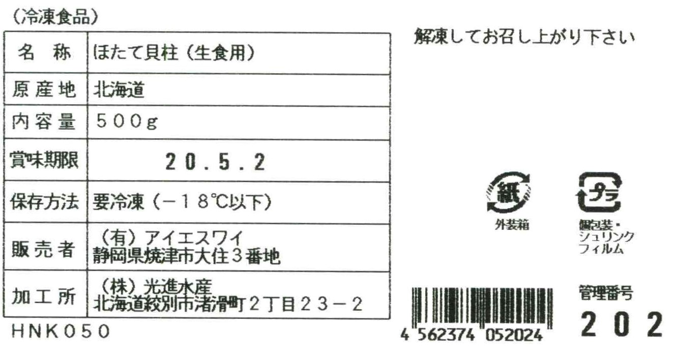 北海道産 生ほたて貝柱 500g 刺身用 生食 急速冷凍