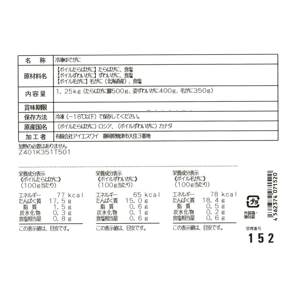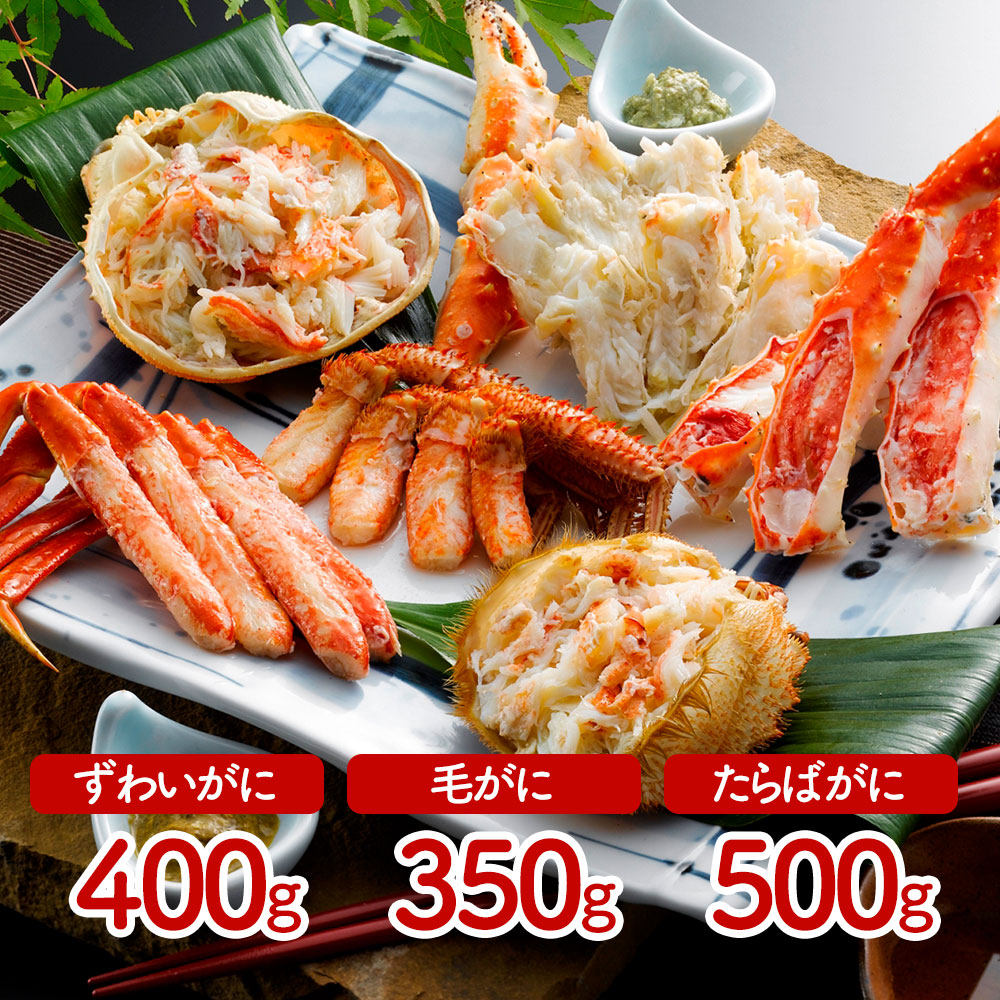 ■規格:ボイル姿ずわいがに400g(カナダ産)、ボイル毛がに350g(北海道産)、ボイルたらばがに脚500g(ロシア、アメリカ産)