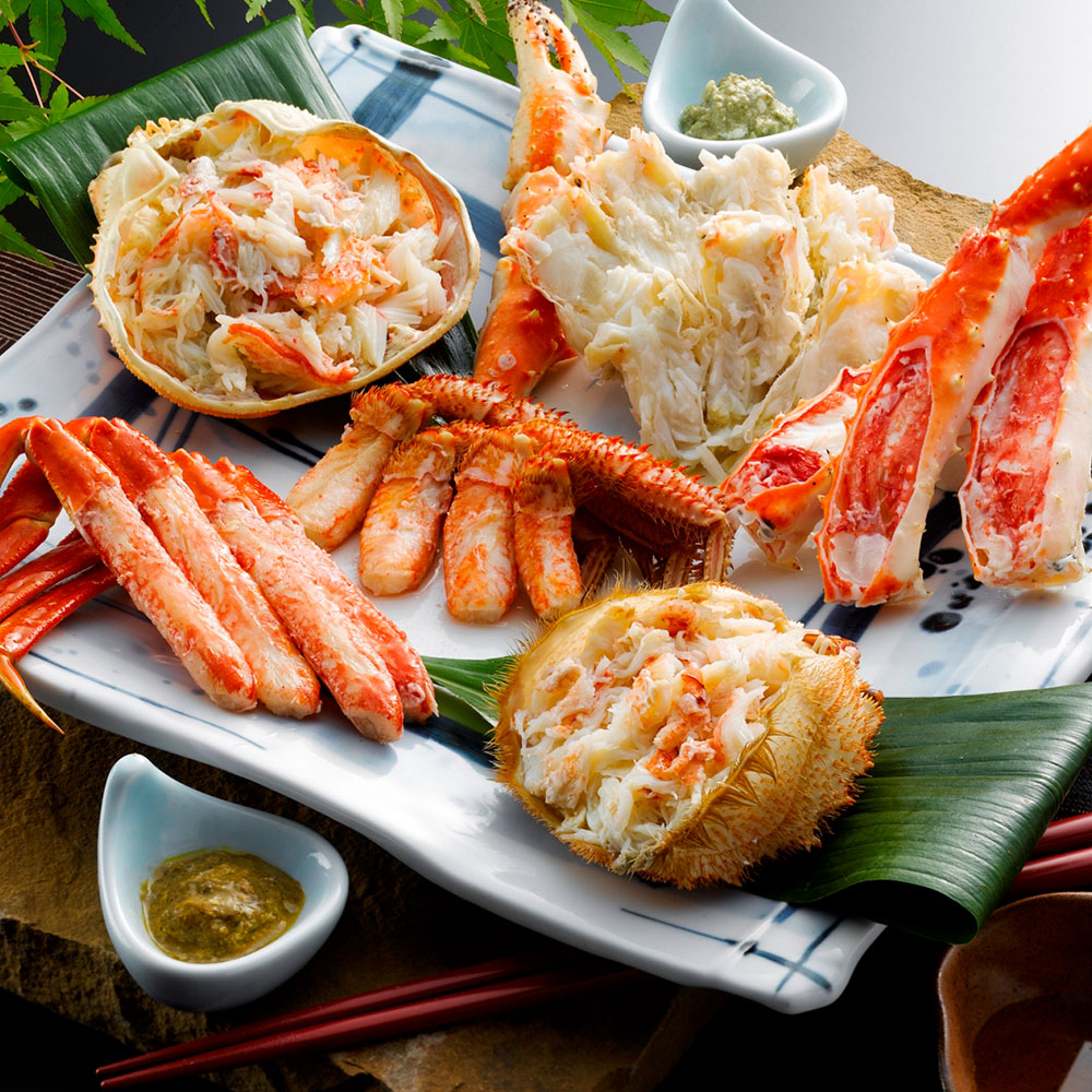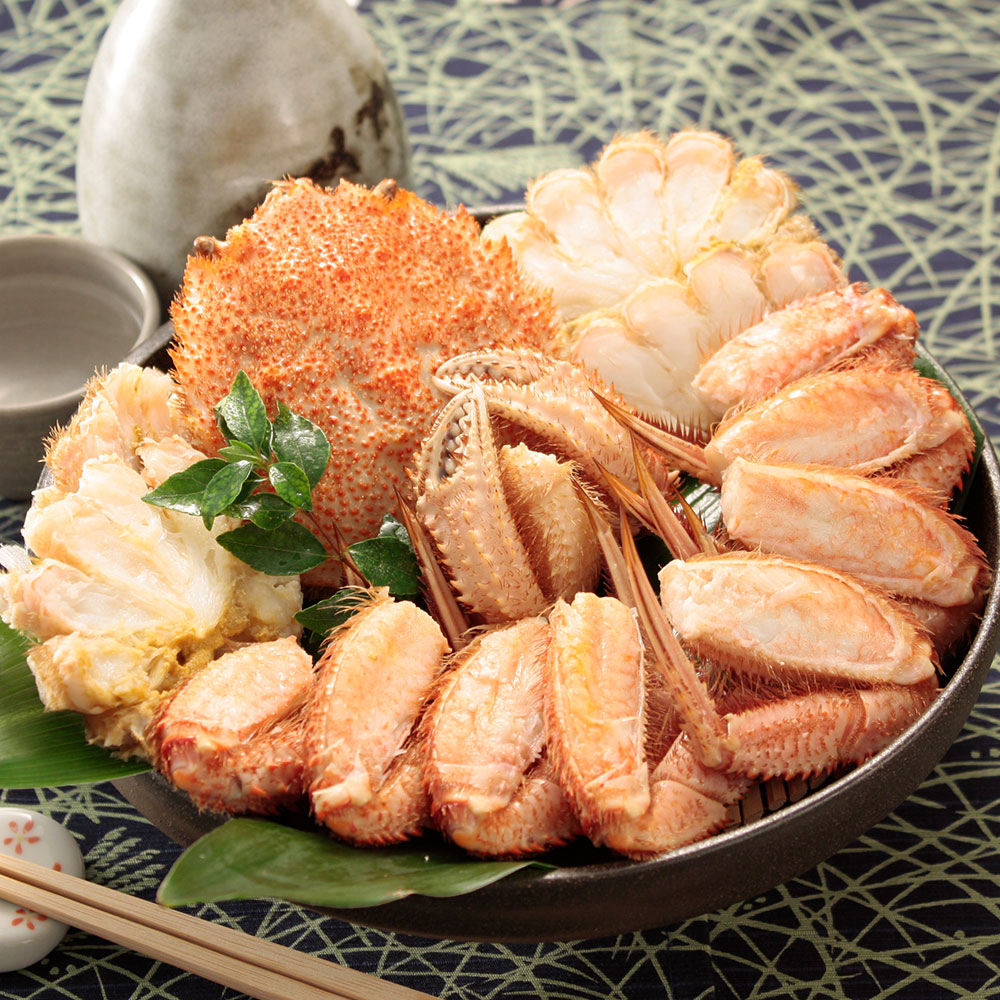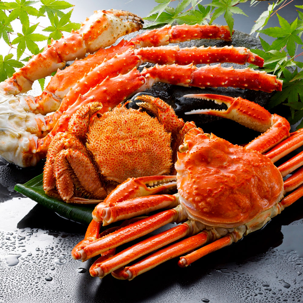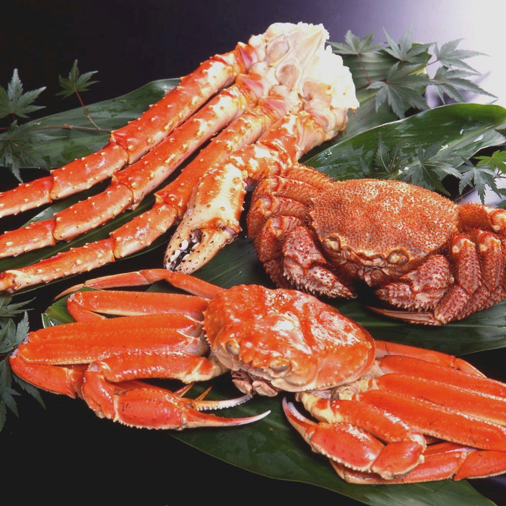 3種類の蟹を詰め合わせに致しました。「ずわいがに」はプリプリの身と甘い蟹みそを、「毛がに」は濃厚な身とみそを、「たらばがに」は食べ応え十分な太い脚を存分に味わってください。蟹好きにはたまらない逸品です。