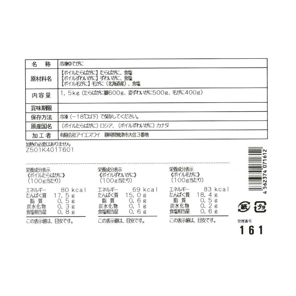■規格:ボイル姿ズワイガニ500g(カナダ産)、ボイル毛がに400g(北海道産)、ボイルタラバガニ脚600g(ロシア、アメリカ産)