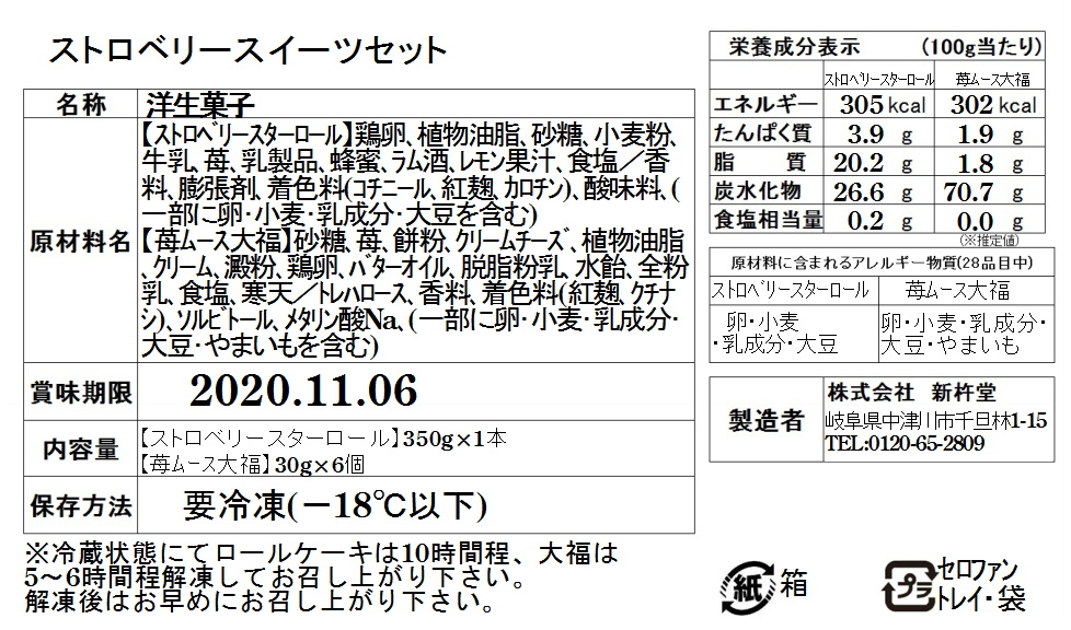 ●ストロベリースターロール:鶏卵、植物油脂、砂糖、小麦粉、たんぱく質、牛乳、苺、乳製品、蜂蜜、ラム酒、レモン果汁、食塩/香料、膨張剤、着色料(コチニール、紅麹、カロチン)、酸味料、(一部に卵・小麦・乳成分・大豆を含む)