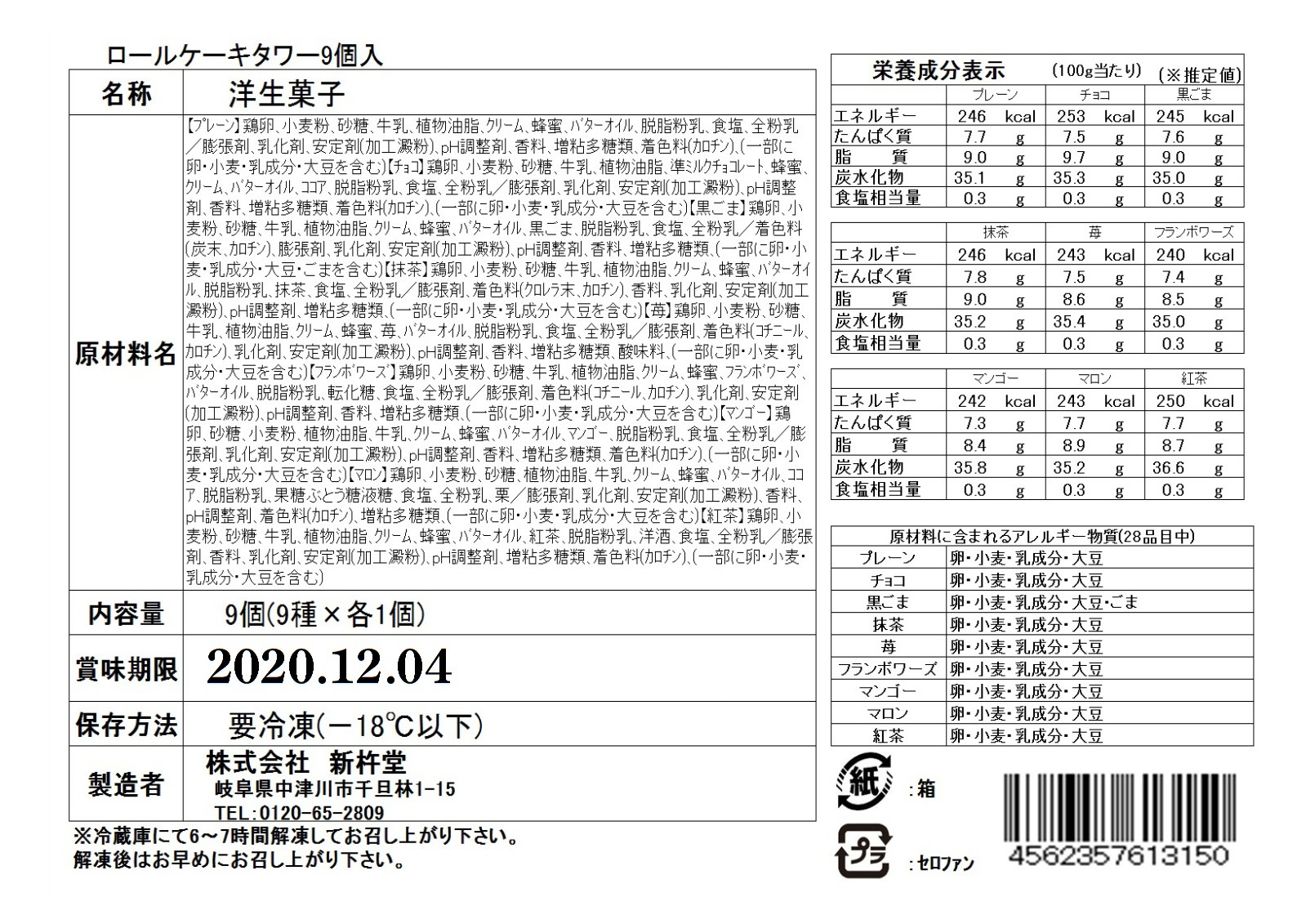 ●マンゴー:鶏卵、砂糖、小麦粉、植物油脂、牛乳、クリーム、蜂蜜、バターオイル、マンゴー、脱脂粉乳、食塩、全粉乳/膨張剤、乳化剤、安定剤(加工澱粉)、pH調整剤、香料、増粘多糖類、着色料(カロチン)、(一部に卵・小麦・乳成分・大豆を含む)