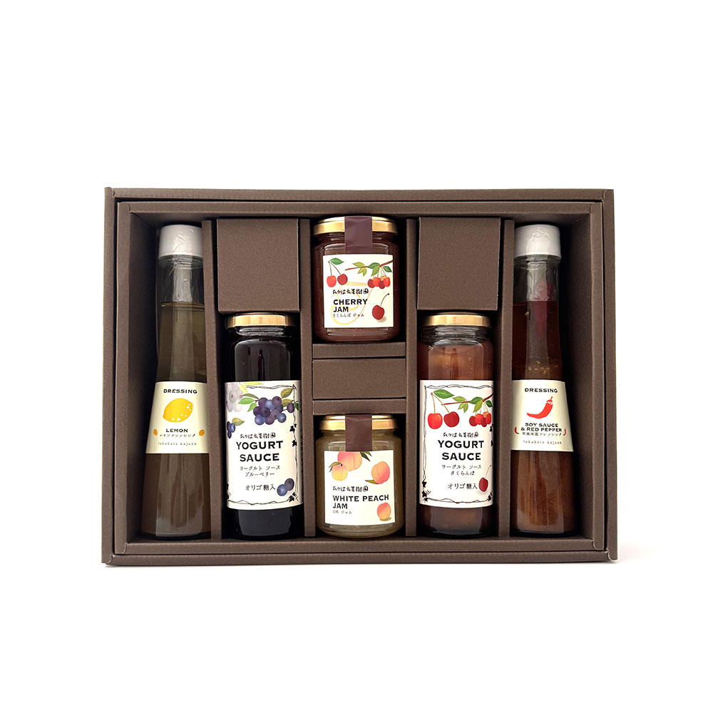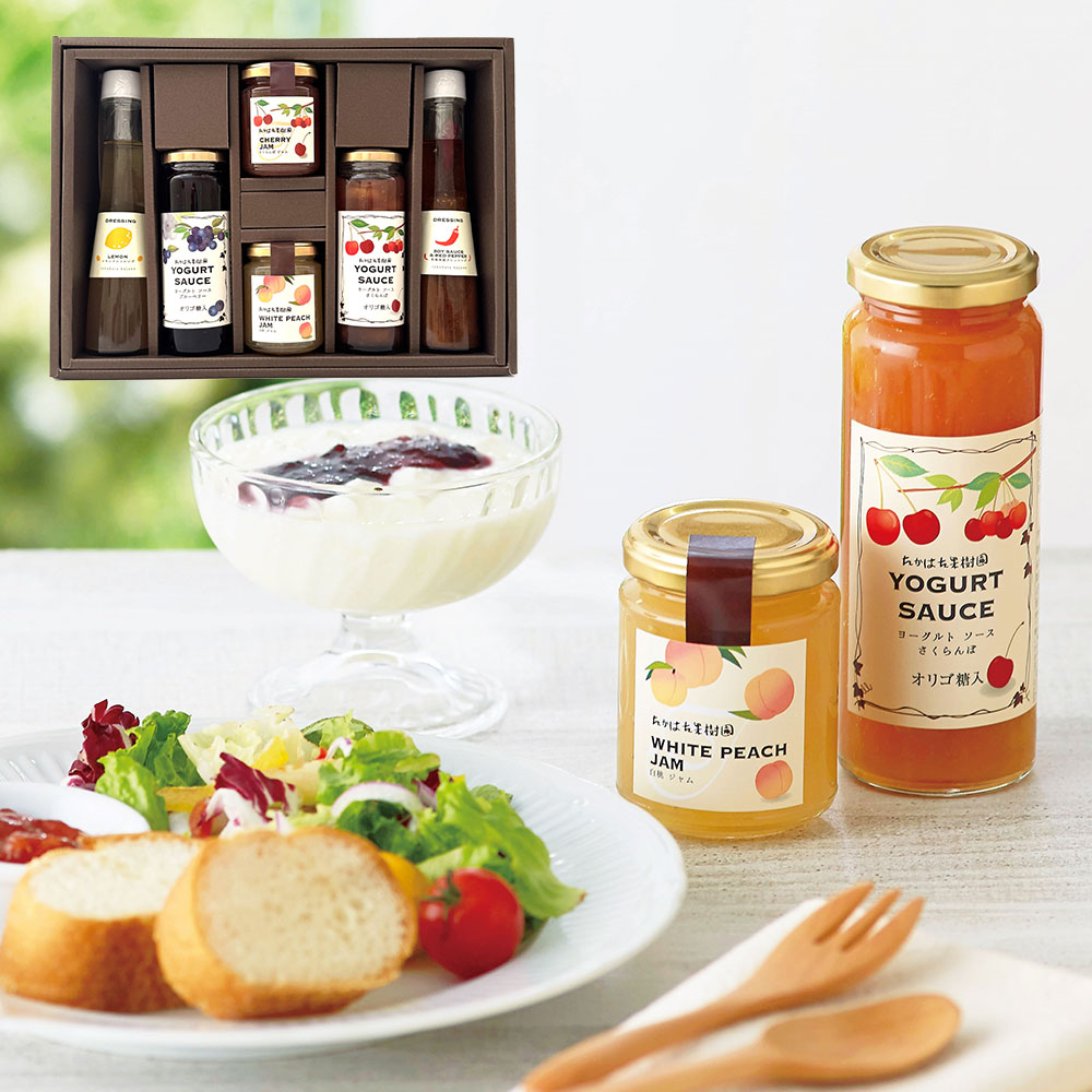 ■規格:ジャム150g(白桃×1、サクランボ×1)・ドレッシング150ml(和風南蛮×1、レモン×1)・ヨーグルトソース220g(ブルーベリー×1、さくらんぼ×1)