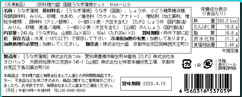 ●うなぎ蒲焼:うなぎ(国産)、しょうゆ、ぶどう糖果糖液糖、発酵調味料、みりん、砂糖、水あめ、/着色料(カラメル、アナトー)、増粘剤(加工澱粉、増粘多糖類、調味料(アミノ酸等)、(一部に小麦・大豆を含む)