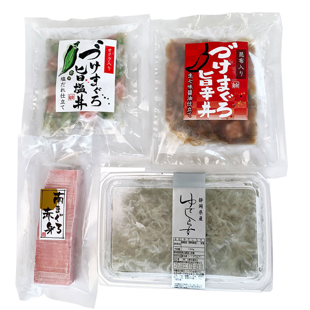 高級南まぐろの赤身と簡単お手軽の鮪丼を2種類にゆでしらすを詰合せました。