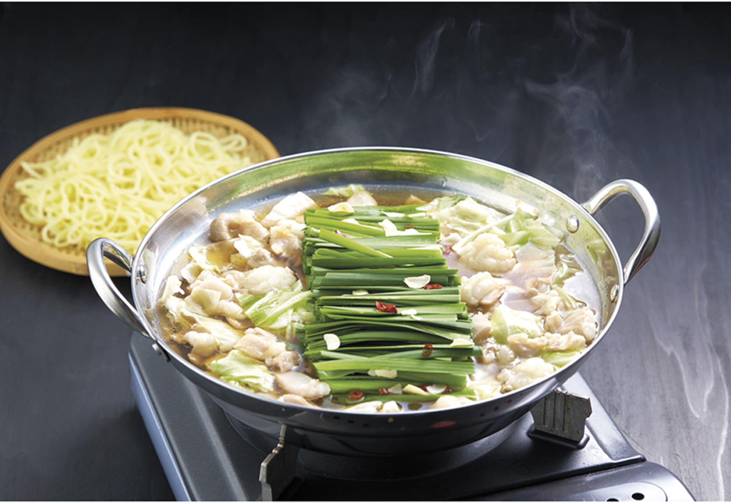 博多の美味を代表するひとつの『もつ鍋』。牛もつはもちろん国内産を使用。キャベツ、ニラなどたっぷり入れて食べたあと、うれしい『しめ』のちゃんぽん麺付き。
