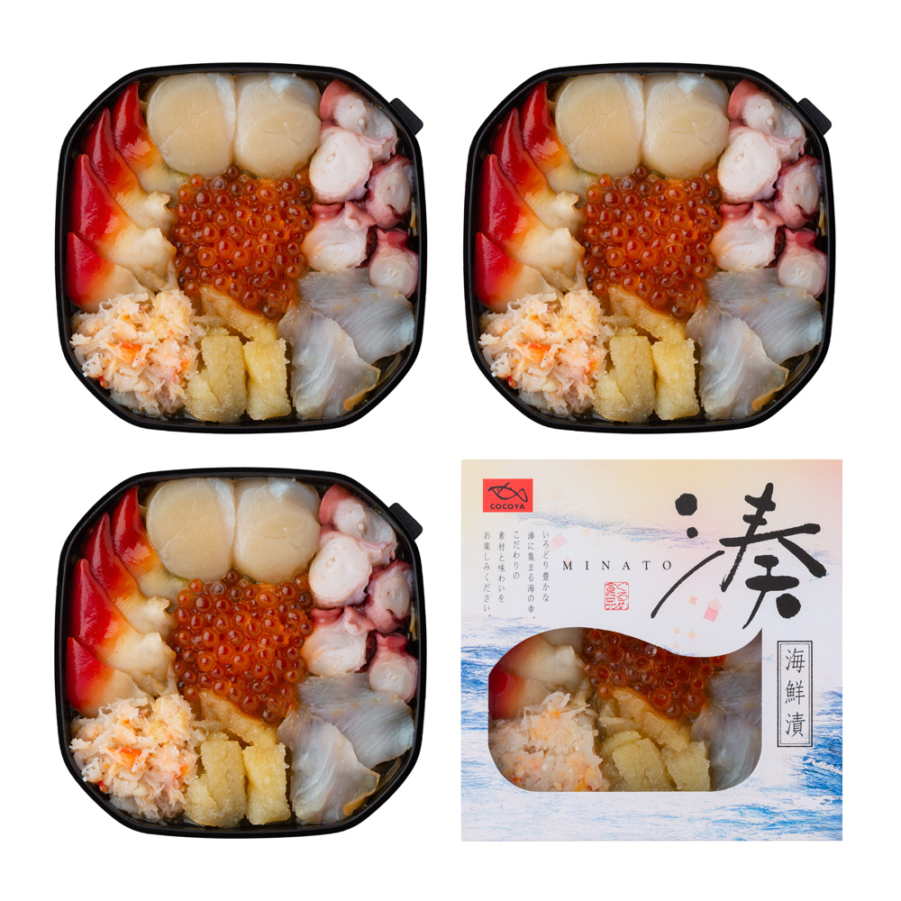 ●松前漬(いか、醤油、砂糖、還元水飴、昆布、発酵調味料、その他)、ほたて、ひらめ、いくら醤油漬(鮭卵、醤油調味液)、ホッキ、ズワイガニフレーク(ズワイガニ、食塩)、魚卵醤油漬(トビ魚卵、数の子、醤 油、その他)、調味たこ(たこ、醤油調味液)、めかぶ、味付数の子/酒精、調味料(アミノ酸等)、増粘多糖類、pH調整剤、トレハロース、ソルビトール、乳酸Na、酸味料、カラメル色素、甘味料(ステビア)、(一部にいか・小麦・大豆・いくら・かに・乳成分を含む)