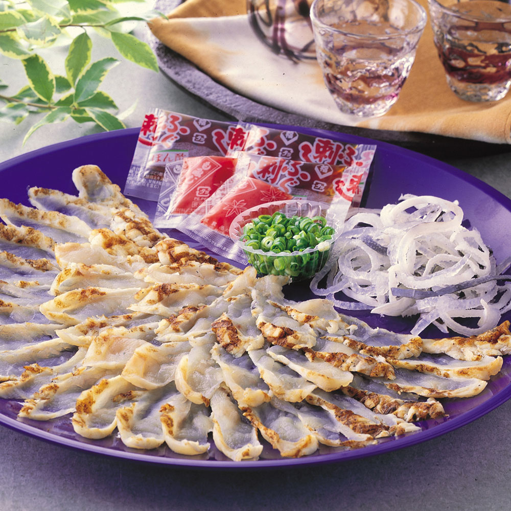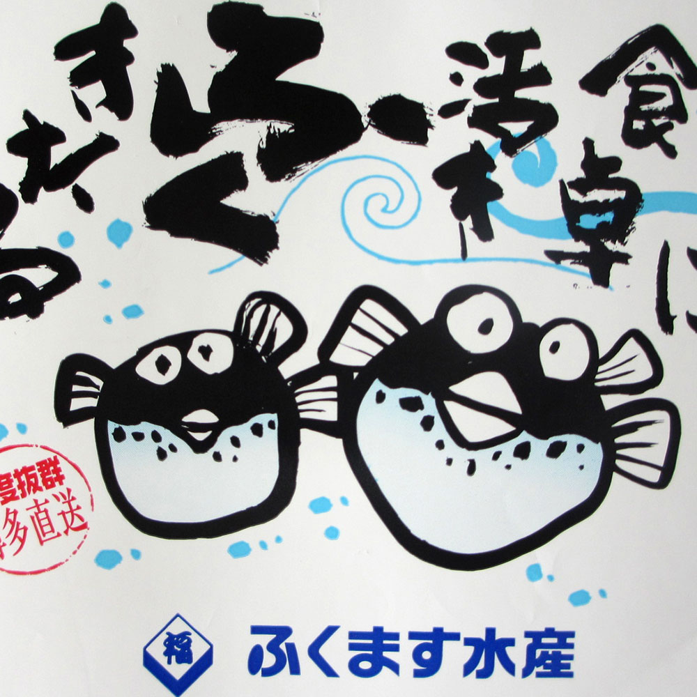 ●まふぐ(福岡県産)、とらふぐ(大分県産養殖)、ねぎ、醤油、醸造酢、だいだい果汁、ぶどう糖果糖液糖、食塩、かつおエキス、こんぶエキス、酵母エキス、大根、唐辛子、調味料(アミノ酸等)、酸味料、乳化剤、酒精、乳酸、甘味料(ステビア、甘草)、香料、モナスカス色素、(原材料の一部に小麦・大豆を含む)