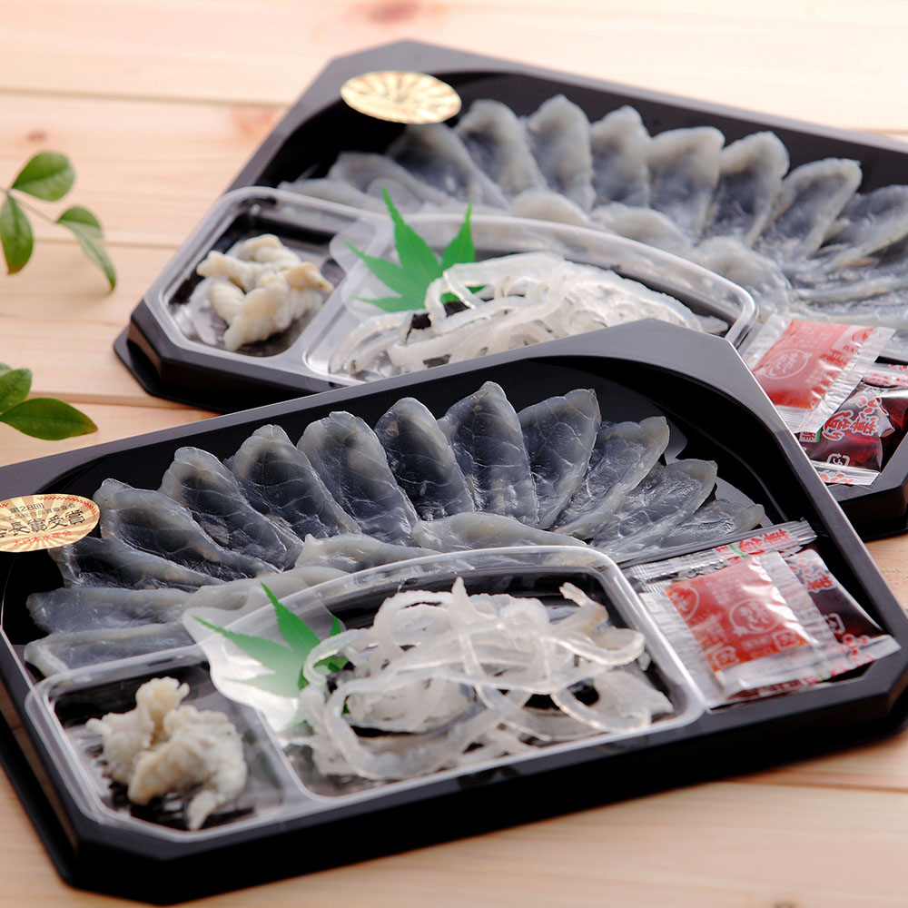 ■規格:(とらふぐ刺身30g、とらふぐ皮10g、とらふぐボイル身2ケ、刺身ぽん酢10g、もみじおろし2g)×2皿 角皿