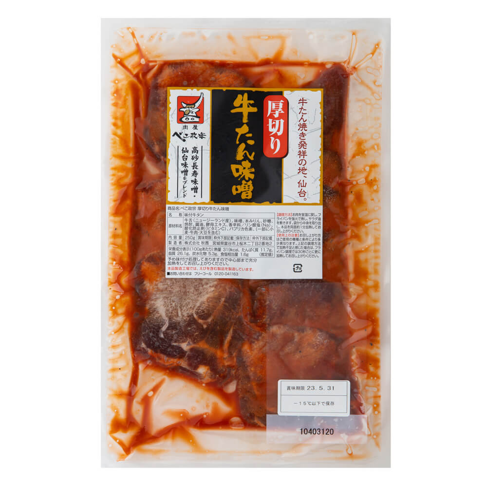 ●厚切り牛タン味噌:牛舌(ニュージーランド産)、味噌、本みりん、砂糖、焼酎、醤油、酵母エキス、香辛料/リン酸塩(Na)、酸化防止剤(ビタミンC)、パプリカ色素、(一部に小麦・牛肉・大豆を含む)
