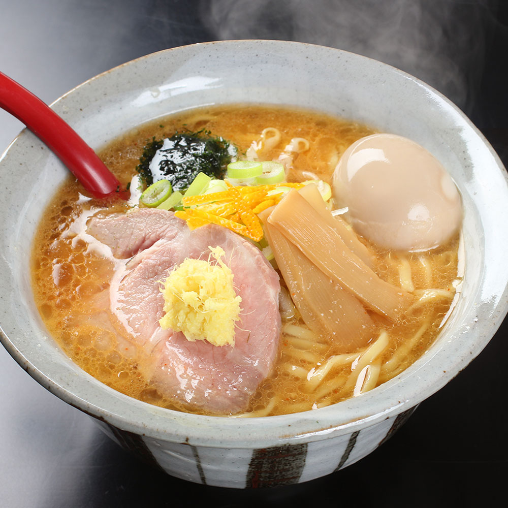 強火で焼き上げた味噌の芳醇な香りと濃厚ながらあっさりとした後味のスープ。生姜、柚子、青のりが旨味を引き立てます。