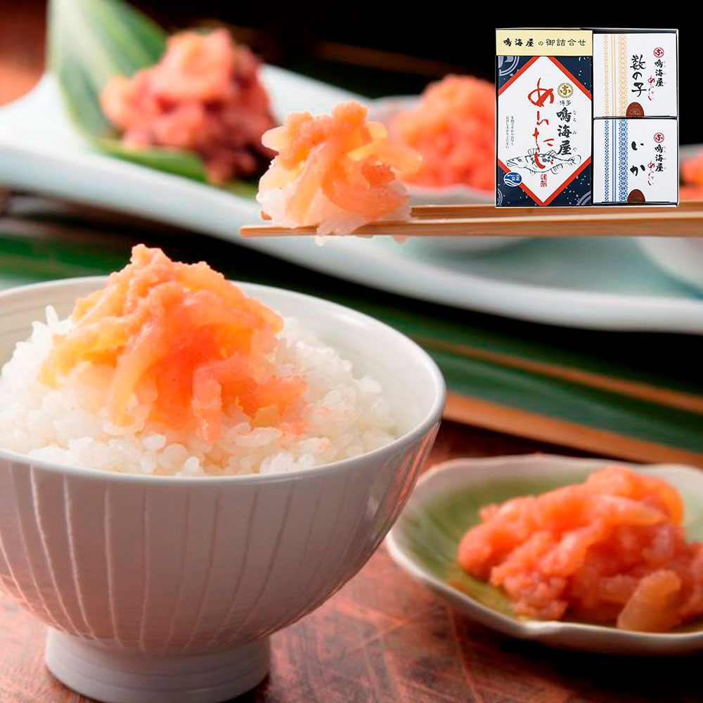 鳴海屋の辛子明太子といかめんたい・数の子めんたいのセットです。いかや数の子が絶妙に辛子明太子と絡まって相性抜群です。そのまま暖かいご飯や酒の肴に最適です。