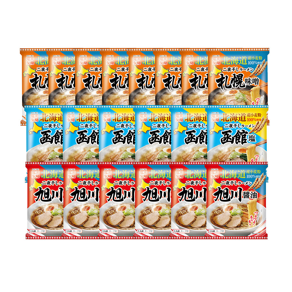 ■規格:北海道二夜干しラーメン札幌味噌108g(めん70g、スープ38g)×8、北海道二夜干しラーメン旭川醤油105.5g(めん70g、スープ35.5g)×6、北海道二夜干しラーメン函館塩104.5g(麺70g、スープ34.5g)×6