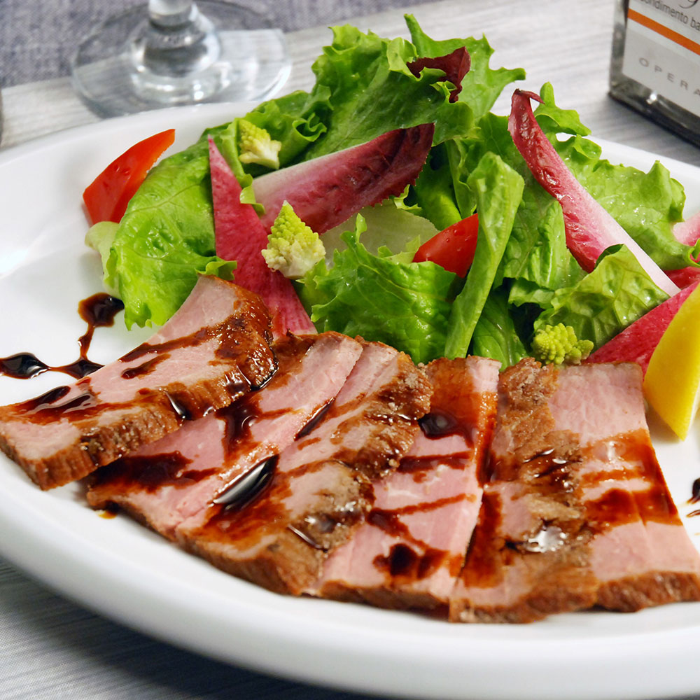 身肉の旨みを感じるしっとりとした味わいの国産牛ローストビーフを9年の歳月をかけ芳醇な香り、酸味、甘みの調和の取れた熟成バルサミコ酢でご堪能ください。